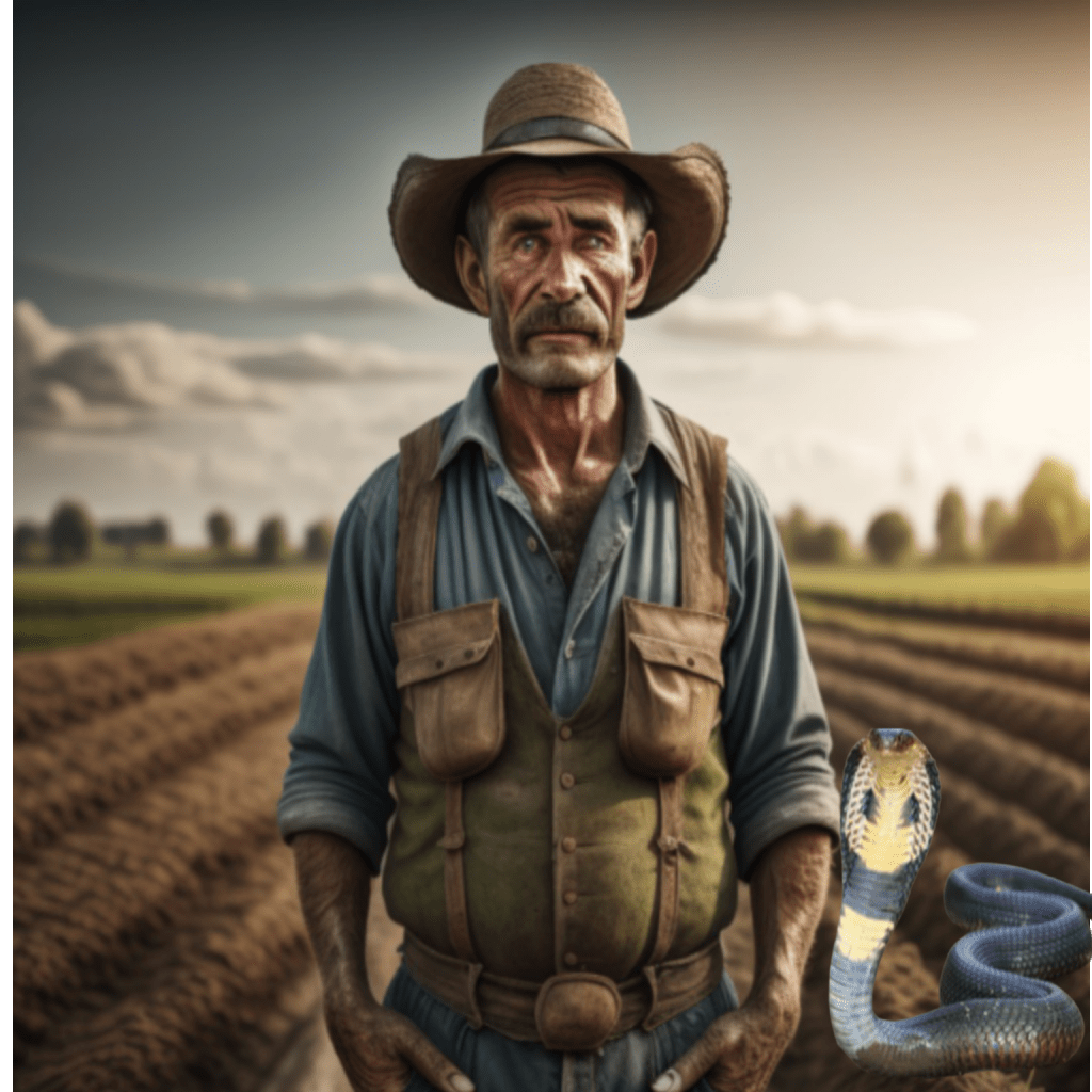 ชาวนาเดินออกจากบ้านในฤดูหนาววันหนึ่ง ระหว่างทางพบงูเห่าตัวหนึ่ง นอนตัวแข็งใกล้ตายอยู่บนคันนา
